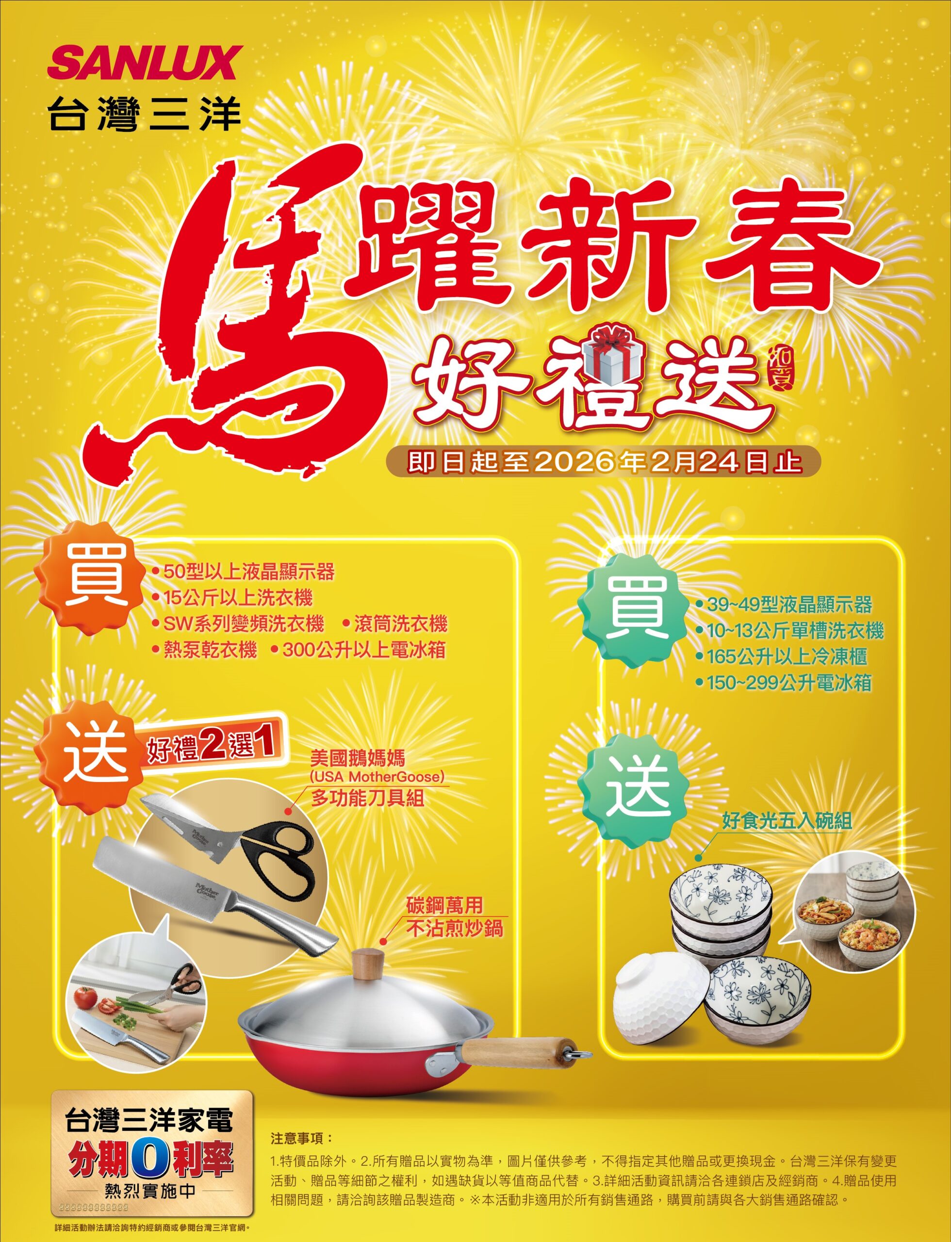 未分類 台灣三洋-馬躍新春好禮送~2026/02/24 2025 年 12 月 30 日 Posted by CEO 01 10 月 台灣三洋-馬躍新春好禮送~2026/02/24 2026年節贈品海報1002ba