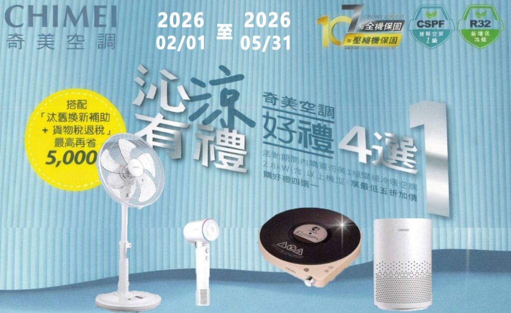 01 10 月 未分類 奇美 沁涼有禮 好禮加價四選一 2026/02/01-2026/05/31 2026 年 1 月 30 日 By CEO 沁涼有禮 好禮加價四選一 2026/02/01-2026/05/31 繼續閱讀