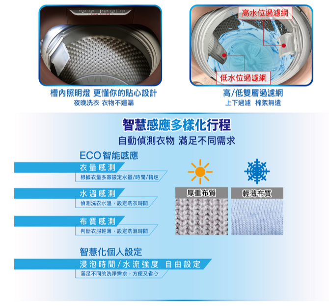洗衣行程選擇 | 標準、污髒、快速、記憶、毛毯、柔洗、護嬰、槽洗淨 | |