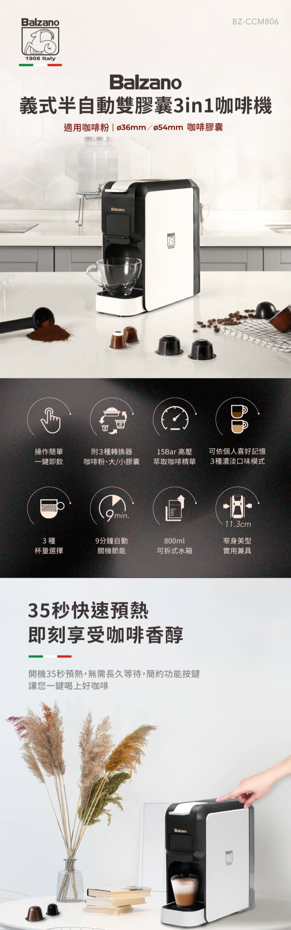 SAMPO聲寶【Balzano】義式半自動雙膠囊3 in 1咖啡機 BZ-CCM807