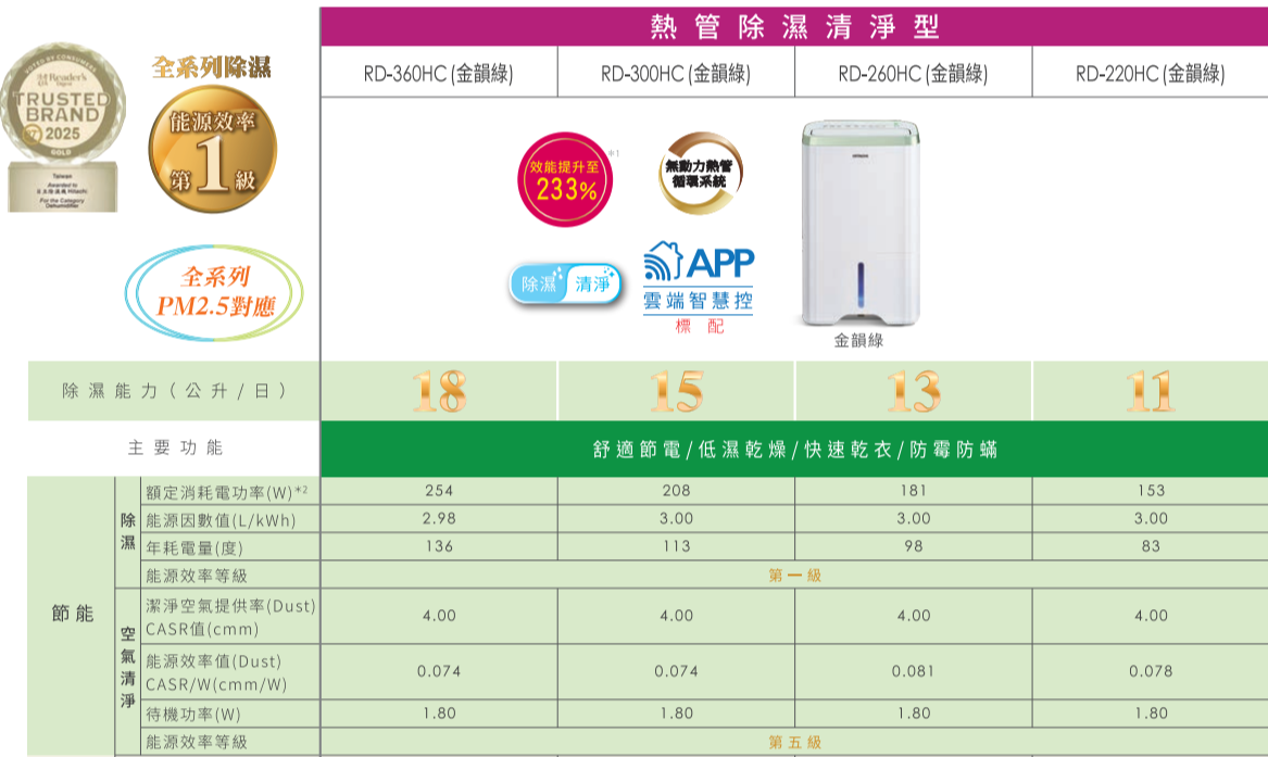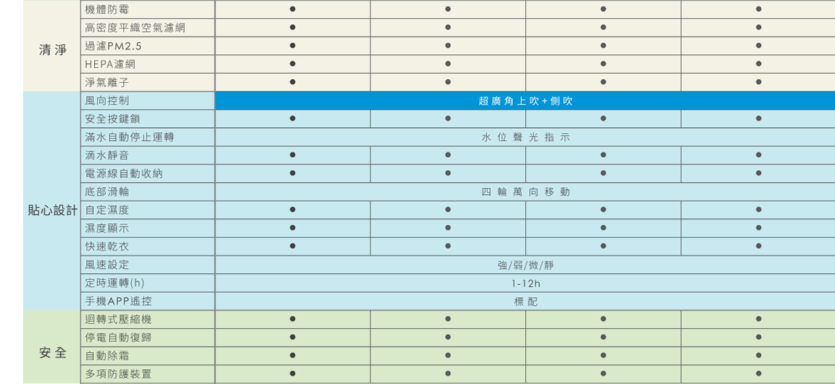 顏色:金韻綠 除濕能力:13公升/日 舒適節電 / 低濕乾燥 快速乾衣 / 防霉防蟎 除濕額定消耗電功率:181W 能源因數值:3.00L/kWh