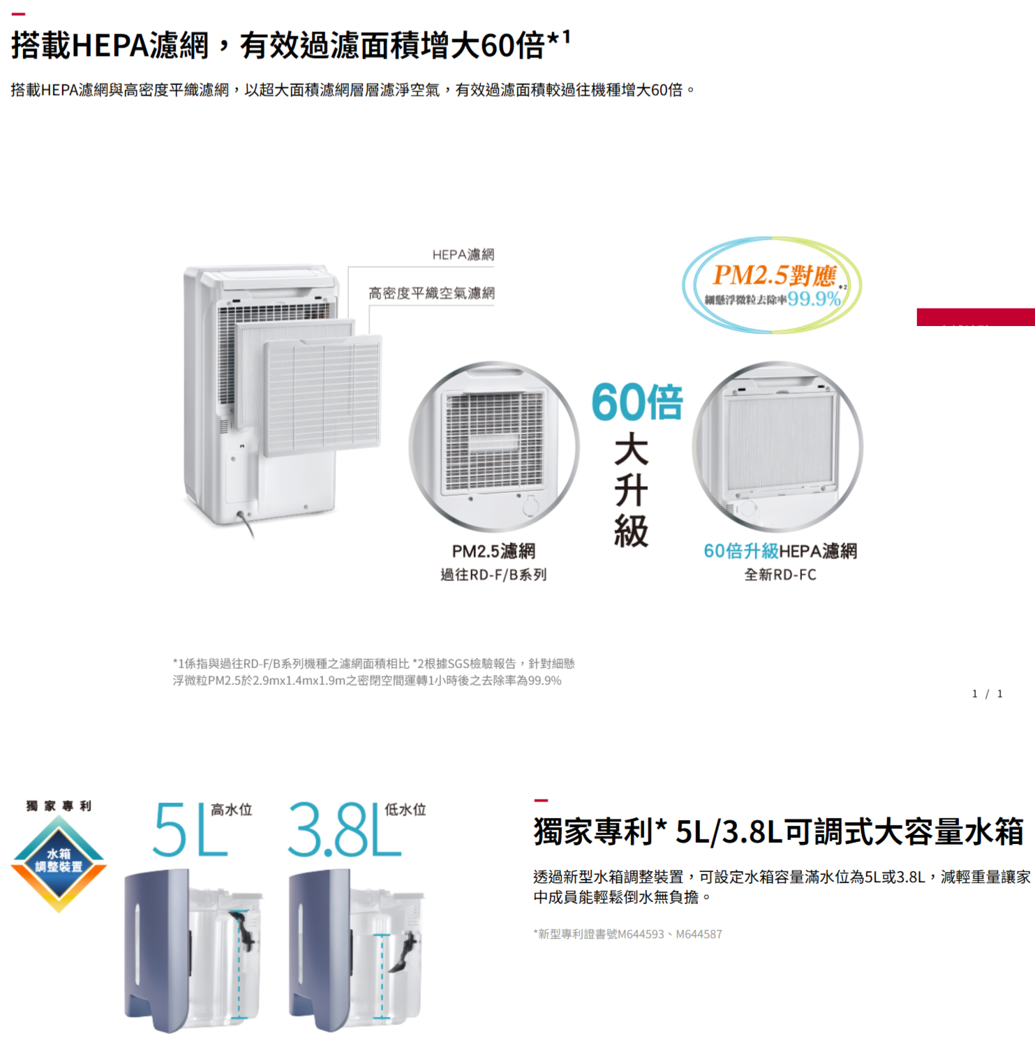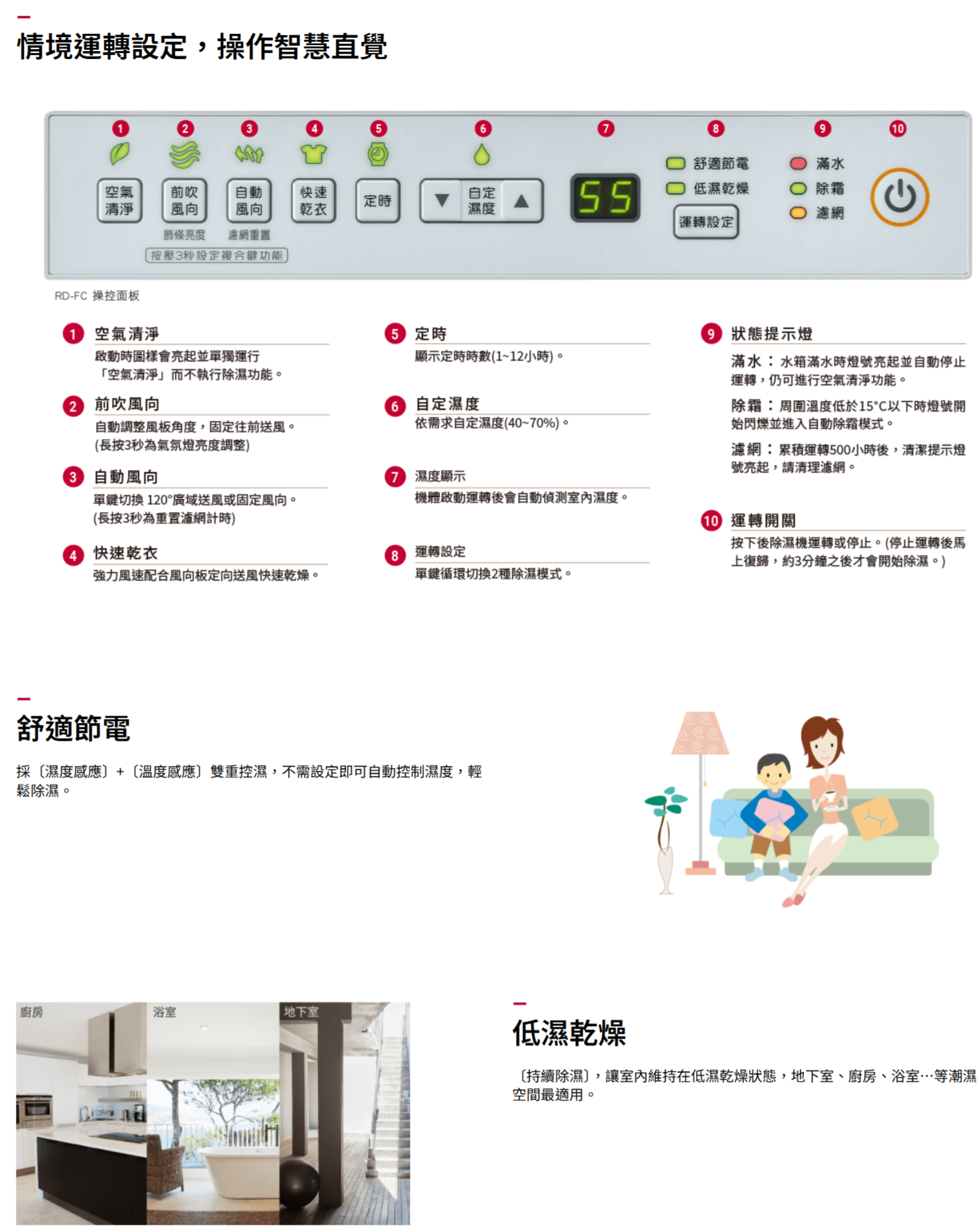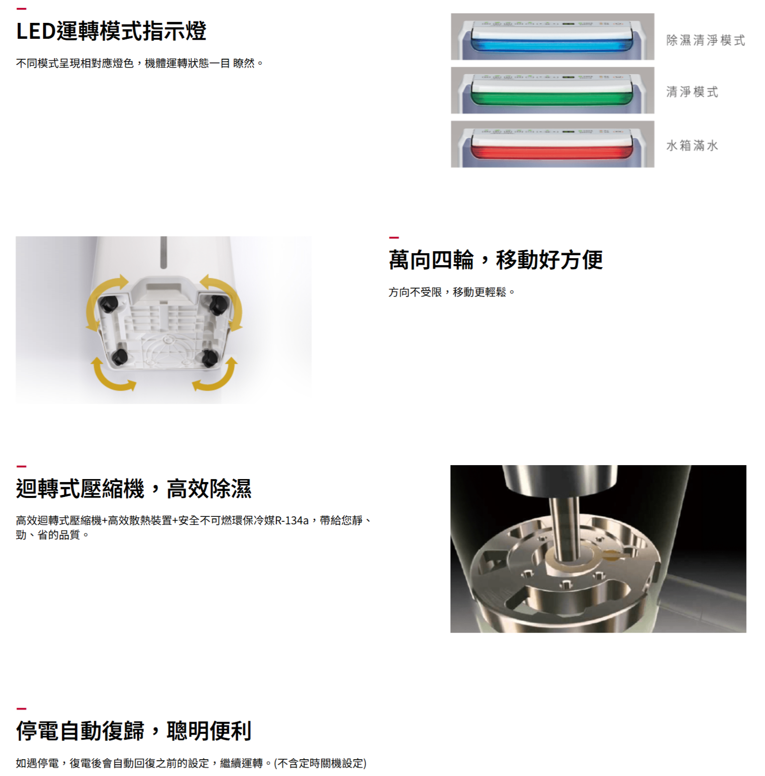 除濕能力:9公升/日 舒適節電 / 低濕乾燥 快速乾衣 / 防霉防蟎 除濕額定消耗電功率:147W 能源因數值:2.55L/kWh