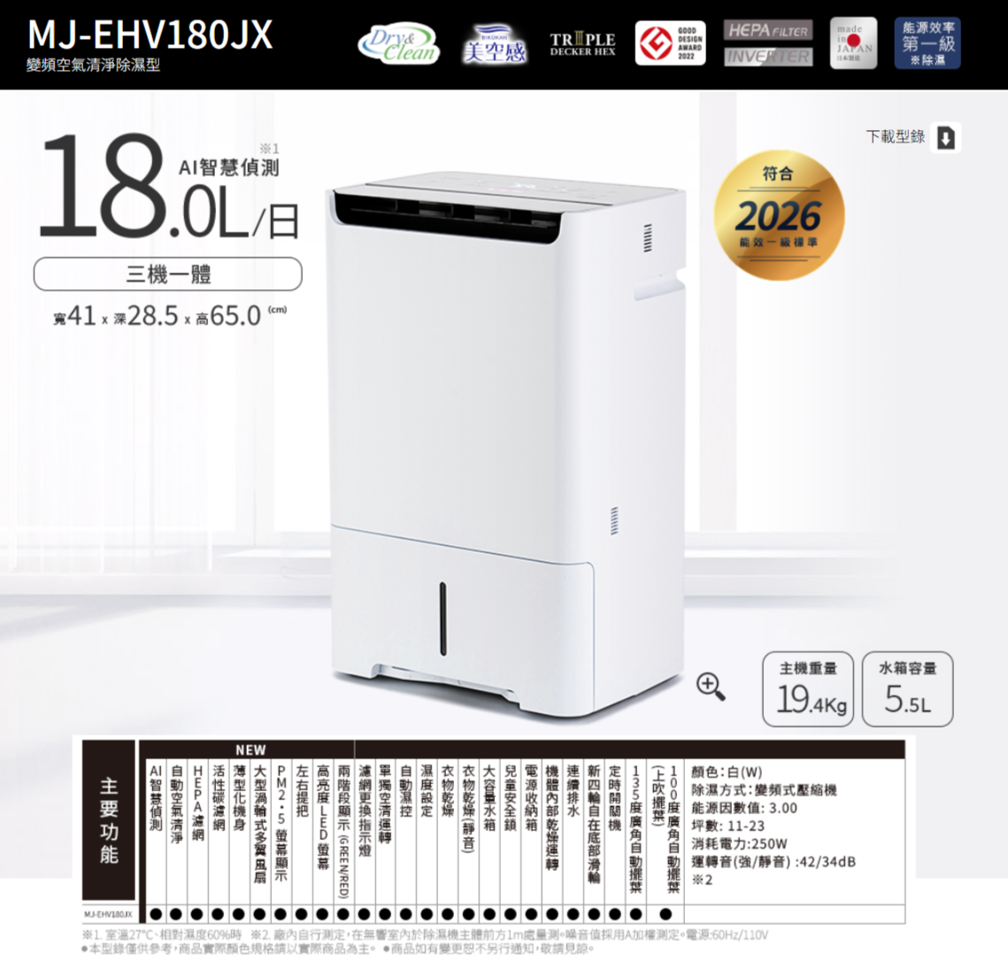 貨號: MJ-EHV180JX-TW 分類: MITSUBISHI三菱, 所有商品分類, 生活家電, 除濕機